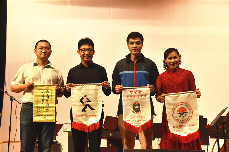 此外,为增强三地校际间的音乐交流互动,活动当天,广州市青年文化宫还与香港假日萨克管乐团、圣公会(澳门)蔡高中及广州市南沙区金隆小学的乐团代表相互交换锦旗,以表情谊。