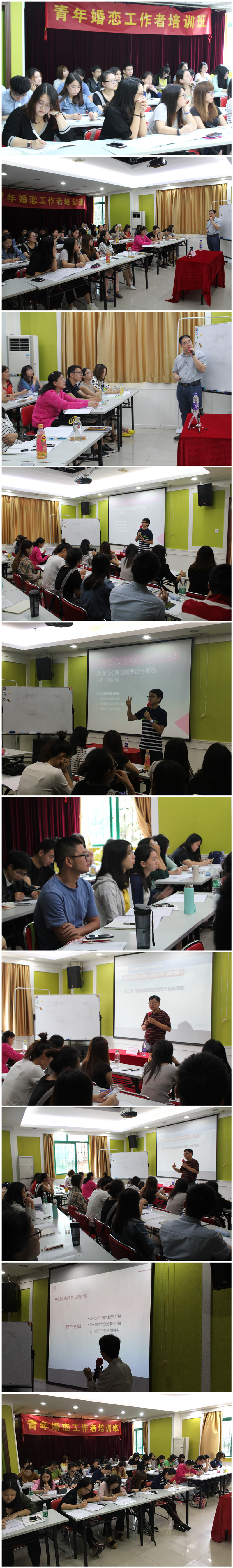 10月14日—15日,由共青团广州市委员会、广州市青年婚恋服务促进会、广州市心理咨询师协会、广州市律师协会婚姻家庭法律专业委员会、广州市青年文化宫、广东省晴朗天心理职业培训学校联合组织的首期婚恋工作者知识培训班,在青宫二楼婚恋研究中心举行。来自珠江实业、广东外语外贸大学等基层团委组织,广州各婚恋服务公司以及社会工作服务中心等机构的38名相关婚恋工作人员参与了此次培训。