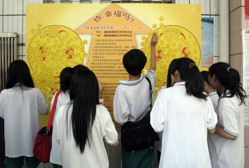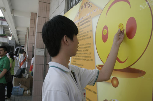 “幸福天平”和“心理测试游园”引发了同学们强烈的兴趣,每逢课间,心理测试游园区内都是人头涌涌,而“幸福天平”的两端也贴满了近两千个代表了“拥有”和“缺憾”的小头像。“幸福这个词谁都知道,但是我从来没有想过自己其实幸不幸福,怎样才能更幸福。这个‘幸福天平’一下子把幸福指数量化了,感觉还是蛮震撼的。”站在“幸福天平”前“计算”自己“微笑脸”与“扁嘴脸”得分比例的小兰如是说。据不完全统计,“幸福天平”上揭示幸福与否的“拥有”和“缺憾”比率平均值为1.86,有76%的同学幸福感较为明显,24%的同学需要进一步调整心态,增强幸福指数。