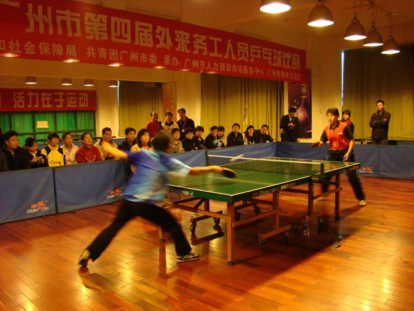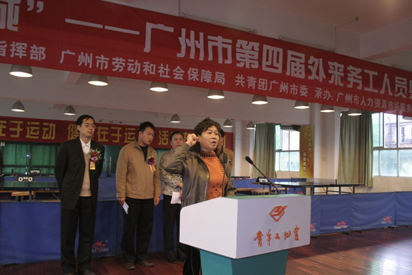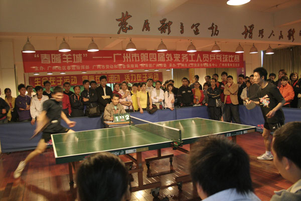 “春暖羊城——广州市外来务工人员迎春乒乓球赛”旨在丰富留穗过年的外来务工者的节日娱乐生活,鼓励他们发扬团队合作、奋发向上的精神,共同建设和谐广州。本届乒乓球赛由广州地区春运指挥部、市劳动和社会保障局、团市委主办,市人力资源市场服务中心、青宫承办。广州地区春运指挥部副总指挥、市劳动保障局副局长钟丽英及团市委副书记安建国出席比赛开赛仪式并讲话,他们感谢外来务工者为广州的城市建设及各行各业的发展所作的贡献,希望留穗过年的他们在广州过上一个愉快美满的春节。