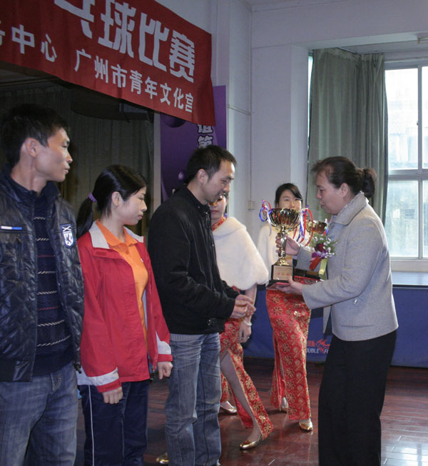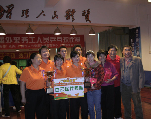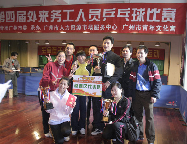 在钟丽英副局长跟选手代表“对打”的开球仪式后,来自市直属机关、越委区、荔湾区、海珠区、开发区、黄埔区、从化市等十区二市的外来务工乒乓球好手进行了男女单打和男女混合团体比赛。在一片加油声中,选手们全情投入比赛中,漂亮的接发球,精彩的扣杀,赢得现场观看者的阵阵喝彩声,已经分不出谁是对手、谁是自己人。比赛在参赛者互相欣赏、互相切磋球艺中落下帷幕,获得男女单打和男女混合团体1—5名的选手和团体,捧着大大的奖杯,笑逐颜开地合影留念,接受同伴的祝福。