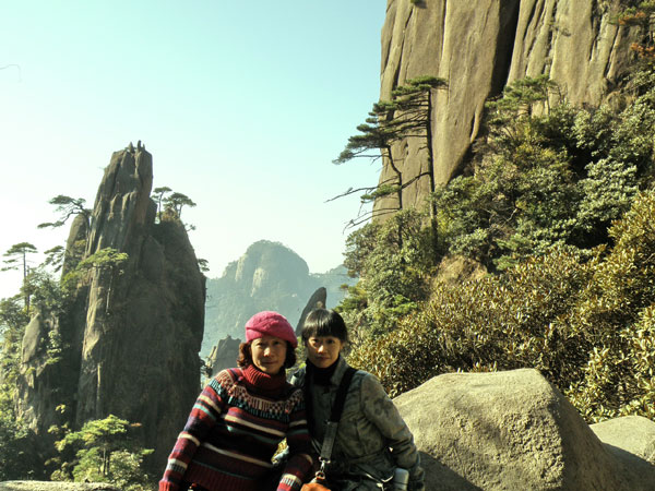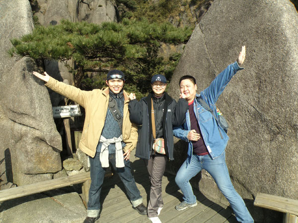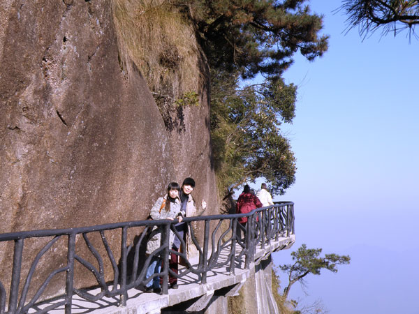 随着地势的不断升高,山上的云雾也逐渐增多,但灿烂的阳光始终一路陪伴着我们,也让这条美其名曰“阳光海岸”的登山路线名副其实。走在栈道上,仿佛伸手就可触摸那些被薄纱般的雾气环绕着的藏青色的山峰和那些形态各异的奇松。就这样行走在云山雾海和奇松怪石之间,让我们几乎忘记了脚下就是悬崖峭壁,而山上特有的清新空气也一扫而空了我们登山的疲累。沿途不乏呼朋引伴之人,让宁静的山道平添几分热闹。