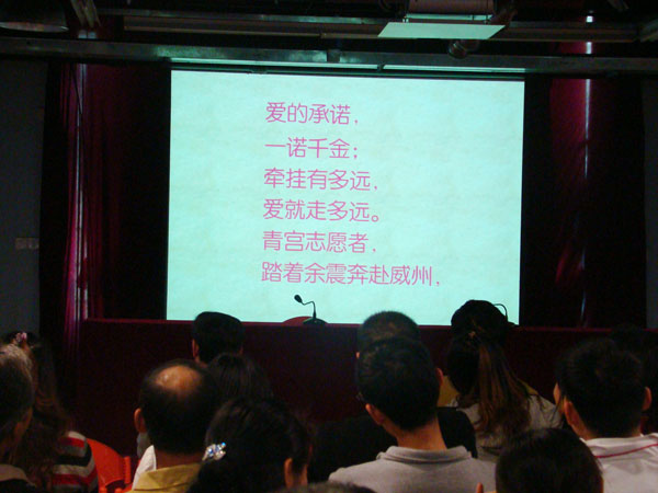 望着由当地志愿者组成的“青春与电影同行”放映队在“穗威青年文化广场”上为当地群众放电影,望着当地能歌善舞的羌族人在“穗威青年文化广场”上跳起欢快热闹的锅庄舞,青宫志愿者们于11月17日依依不舍地离开威州,虽然青宫这次捐献了数字电影放映机及文化广场灯光音响等一批设备,但志愿者们归程的行囊依然沉重,因为仍然满载着对灾区民众的牵挂。娟娟幼儿园那群天真烂漫又衣衫单薄的孩童牵扯着青宫的心,一回到青宫,就着手落实与娟娟幼儿园的结对援助计划,由党总支、主任室、工会、团支部共同发文向青宫员工募集捐款,为幼儿园的孩子购买御寒衣服。不久,又一批青宫志愿者将再赴威州,把温暖的衣物送到孩子们的手上。