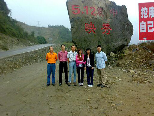志愿队到达映秀镇震中,图中石头是地震掉下的山石。2008-10-21 16:49:12
