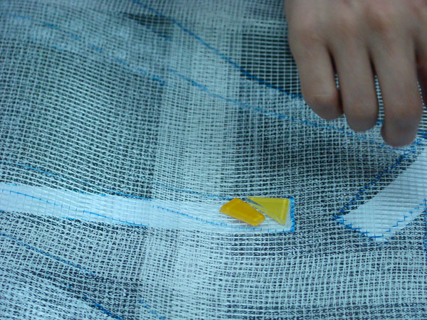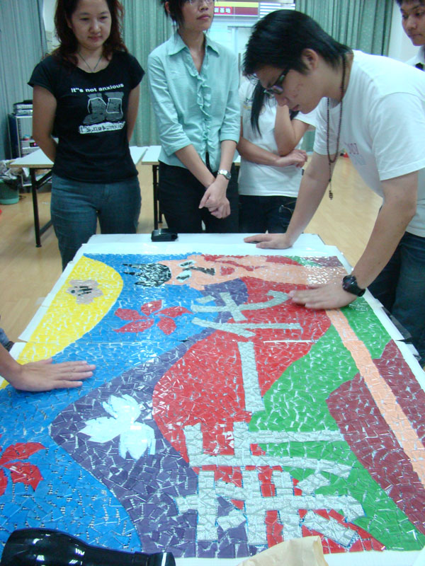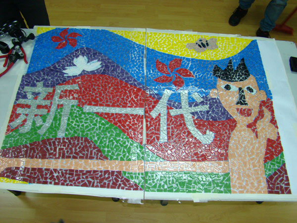 要将这些色彩绚丽的马赛克切割成需要的形状进行粘贴,可不是一件容易的事。这次用来做拼图的马赛克都是用有机玻璃制作而成的,虽然相比作为建筑材料的马赛克更易于切割,但志愿者们还是做足保护措施,在使用专业工具对马赛克进行造型时做了特别保护,避免被飞溅的玻璃碎渣割伤。为了让大家更好地掌握马赛克的切割技巧,导师将志愿者分为三个小组,让大家自由发挥,合作完成一个图案的设计和造型。经过一番练习,志愿者们渐渐掌握了工具的使用方法和切割的技巧,然后把想象力融入到一块一块形状各异的马赛克中——七色的彩虹、盛开的鲜花、孩子们的笑脸和紫荆花区旗慢慢呈现在拼图托板上。经过两天的制作,所有图案都粘贴完成了,随后大家一齐用风筒将未干的乳胶吹干,并仔细检查马赛克有无出现松脱。这最后一道工序完成后,大家对经过共同努力制作而成的作品赞不绝口,纷纷在拼图前摆出各种“甫士”合影留念。