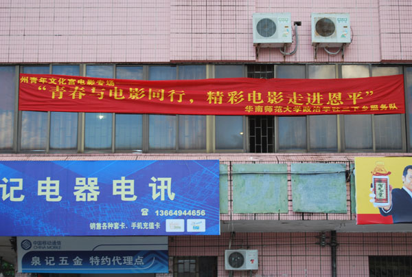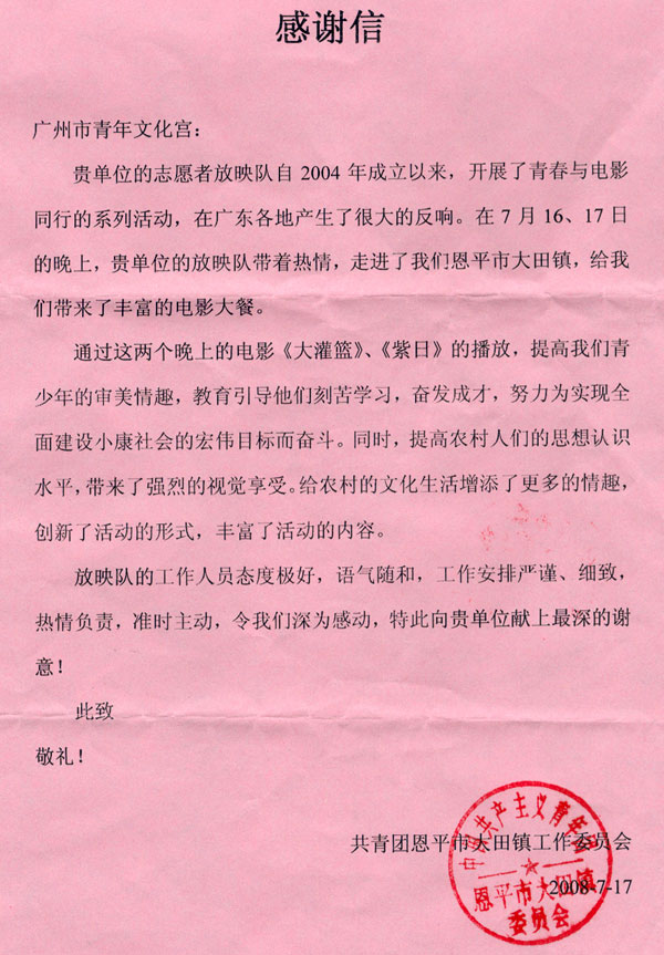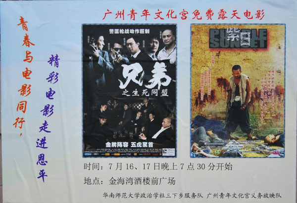 炎炎夏日,燃烧着我们华南师范大学政治学社“三下乡”服务队的热情,燃烧着青宫“青春与电影同行”志愿者放映队无私奉献的心。2008年暑期“三下乡”社会实践活动开始了,我们华南师范大学政治学社赴恩平市大田镇服务队诚邀青宫携手合作,在恩平市大田镇举办了“青春与电影同行——精彩电影走进恩平”的电影宣传教育活动,为大田镇的村民送上美味的电影大餐。因为得到青宫的支持与配合,送电影下乡便成了我们政治学社“三下乡”服务队与别不同的特色,对此,我们除了感谢,还是感谢。