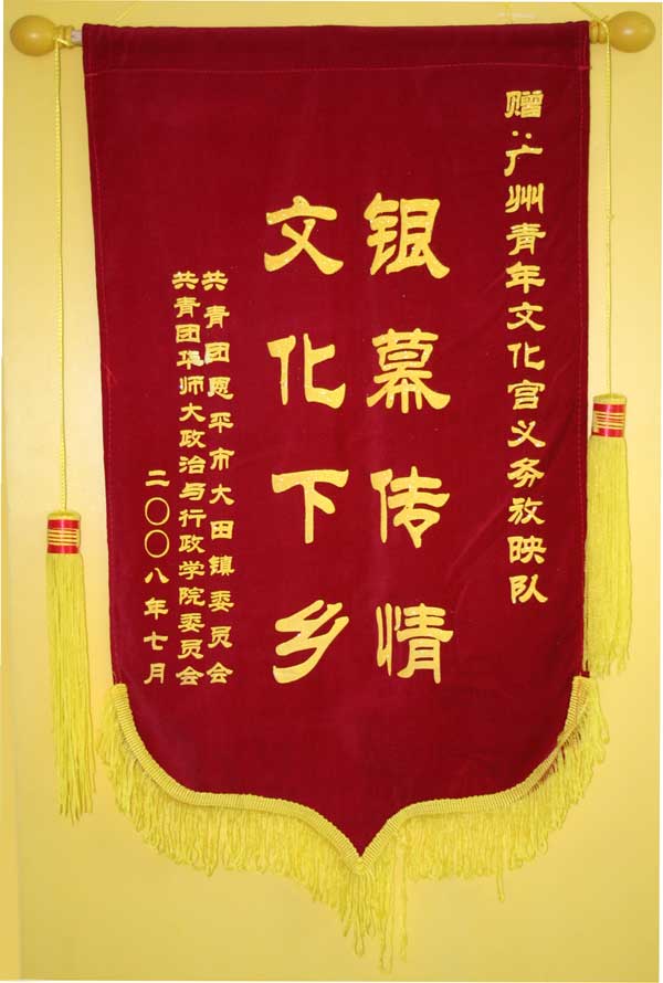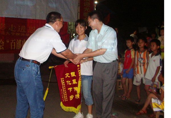 17日晚,我们“三下乡”服务队的负责人向青宫义务放映队赠送了锦旗,并转交了大田镇团委的感谢信,以此表达我们的感激之情。这次电影宣传教育活动能顺利进行,得益于很多方面的因素。首先是我们“三下乡”服务队与青宫义务放映队的亲密合作和紧密配合,二是大田镇领导的支持与配合,三是大田中学同学们和群众的热情参,最后是天公作美,总是在我们正式放映前停雨。