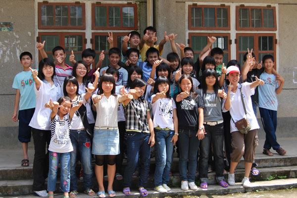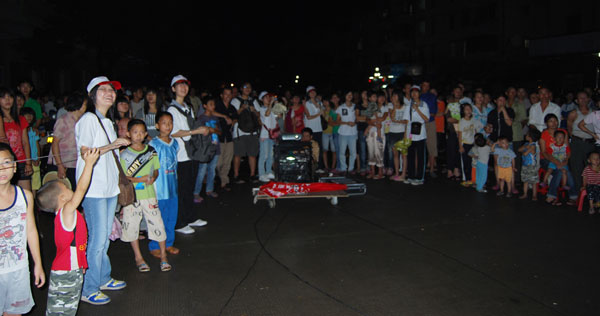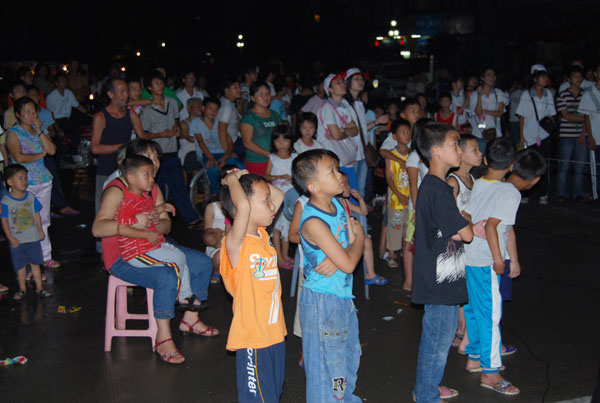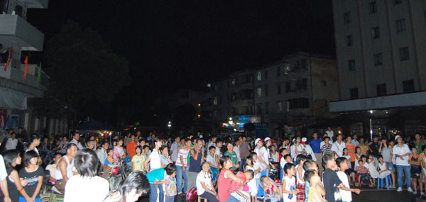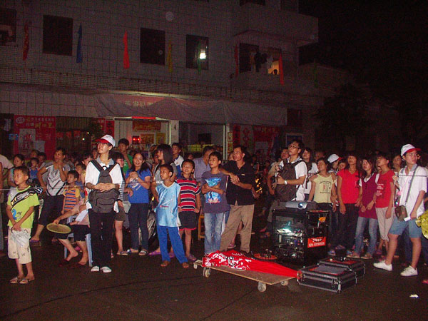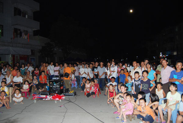 在这两个晚上,我们服务队的同学也忙得不可开交。每晚6:30从大田中学步行出发,准时到放映现场布置。挂横幅、派宣传单、疏导交通车辆、维持秩序……每一项工作,都有条不紊地进行。我们统一服装,以热情的态度和严谨的作风赢得当地群众的好评。