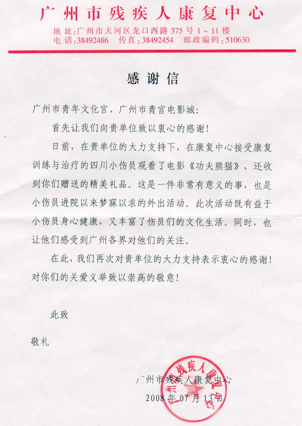 青宫这次“心灵关爱”之举获得了广州市残联的好评,并来函致谢。时间是治疗心灵创伤的良药,在未来的日子里,我们会坚持首善精神,继续为灾区人民奉献爱心。