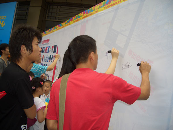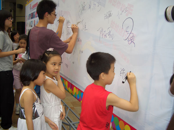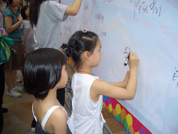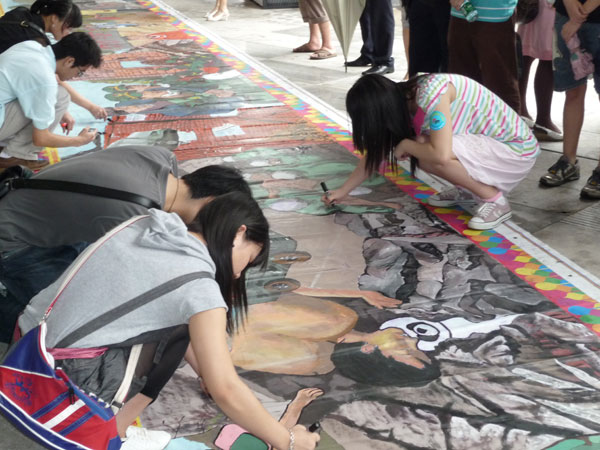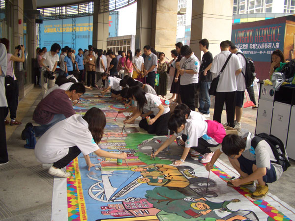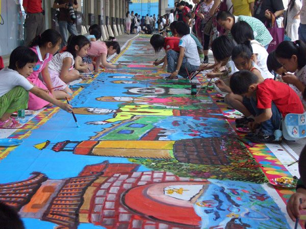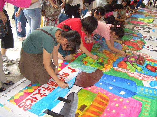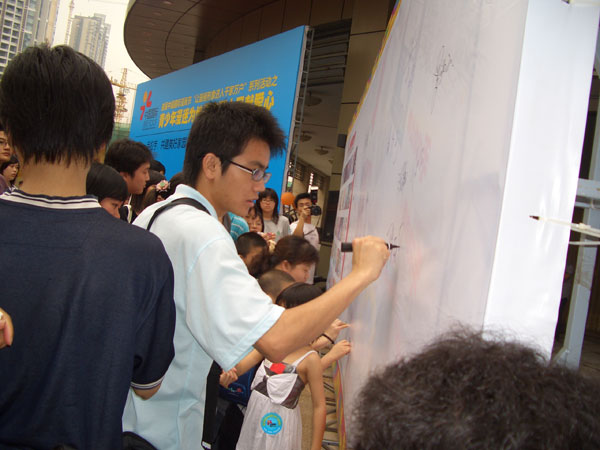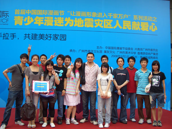 六一节当天下午,“广州市青少年漫迷为地震灾区人民献爱心”活动在广州的新中轴线珠江新城举行,省新闻出版局局长朱仲南、市新闻广播电视局局长范旭及书记周素勤和青宫领导出席了这次活动。由青宫组织的200多名青少年绘画爱好者在长60米的巨幅画布上,尽情地用线条、色彩和万分爱意表达他们对灾区人民的爱和美好祝愿。同学们还特意绘制了50幅手绘漫画作为六一节礼物,代表广州市青少年漫迷送给在广州接受治疗的四川震灾中受伤的儿童,并将他们参加这次创作绘画所得的奖金全额捐献给广州市青少年发展基金会,用于灾后青少年的心理家园重建和结对助学计划。