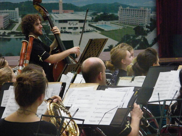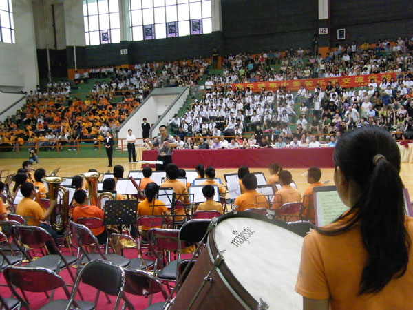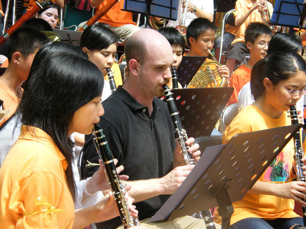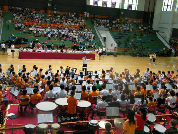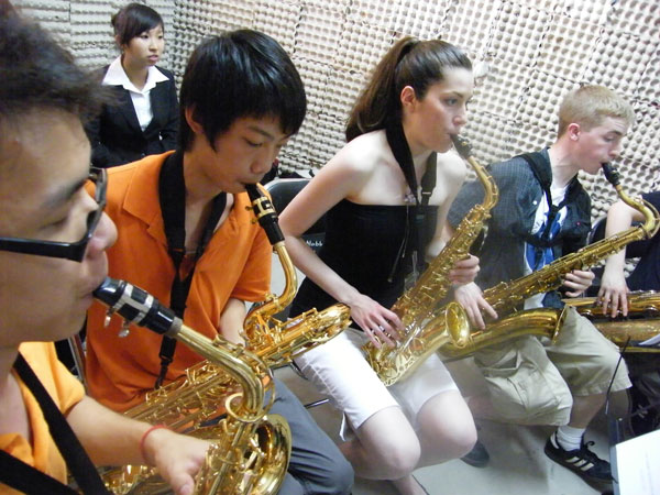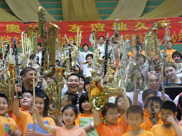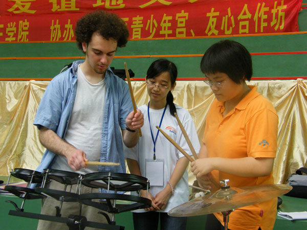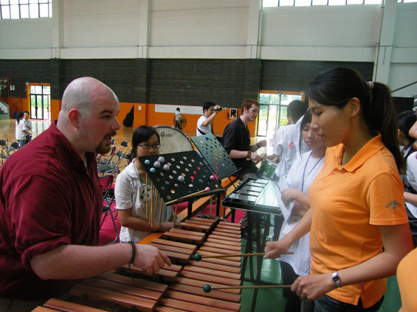 音乐果然是世界性的语言。在音乐交流中,乐手们一个简单的单词,一个形象的比划,彼此已经知道要表达的内容了。那帮“玩”打击乐器的美国乐手,耐心地为中国的小“同行”们示范如何握乐器的锤子、手腕如何用力才能奏出美妙的乐曲。他们虽然因天气炎热而汗流浃背,但仍热情不减,一次一次地演示,一次又一次地互相切磋,默契地共同敲击同一个乐器,享受着跳动的音符传递的友情。