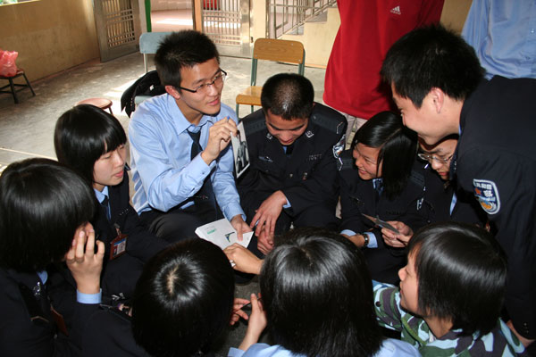 首次参加这个活动,一路上掩不住兴奋的心情。车刚停下,几位学生就热情地向我们围了过来,帮忙搬上课用具。虽然讲座开讲的时间比计划推迟了半个小时,但同学们没有一丝抱怨,而是一直充满期待,这给了我很大鼓舞。课程开始了,张恽老师讲课很有技巧,循循善诱,引导同学们正确区分AIDS和HIV感染者。头脑风暴、角色扮演、游戏体验、分组讨论等等,这都是社会工作专业学生必学的技巧。我不惊讶这些手法在课堂的体现,我惊讶的是张老师竟能把这些手法运用到恰到好处,使得现场气氛一再高涨,使学生们能对“艾滋病”有更深入的思考。
