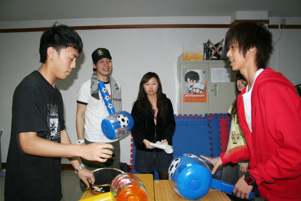 同乐日原来计划在露天的文化广场举行,但看着黑压压的天,大滴大滴的雨,几位老师商量后,决定移到室内展览厅举行。为此各相关人员在自己的岗位上忙碌起来,有的挂背景画,有的吹气球布置场地,有的搬游戏牌,有的试玩游戏……看着这一切,正忙着打印资料的我,因雨天影响而“降了温”的心一下子又“升温”了,这些爱穿宽大裤子,头上常年戴着HIPHOP帽,一听见音乐就左右摇摆,在众人眼里是“怪异”一族的青年人,每次搞活动却总是这么齐心上阵,谁说他们不可爱呢?