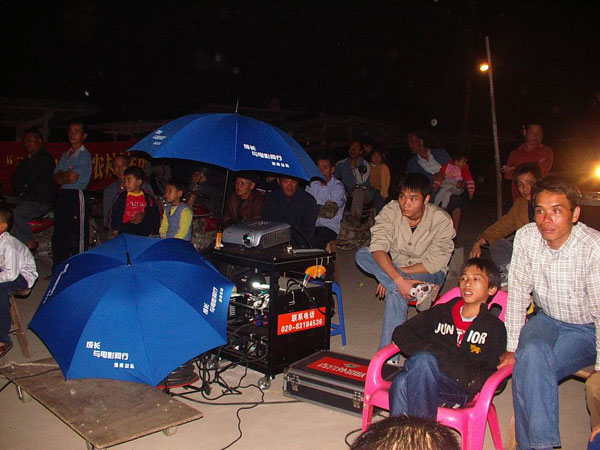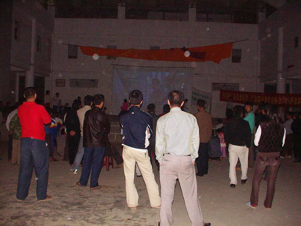 第二天早上,我们从中新镇出发,直奔当天放映的地点石滩镇。当天的放映情况和第一天大同小异。吃中午饭的时候,当石滩镇塘头村村委书记得知我们到农村放映,就马上要求我们去他们村放一场,这样这次放映行程本来安排的四场电影变成了五场,能为村民们多放一场电影,我们也很高兴。接下来的三天放映,我们分别到了增城市的小楼镇、派潭镇,每到一个地方,都同样受到当地领导和群众的热情欢迎,感谢我们把电影送到农村。