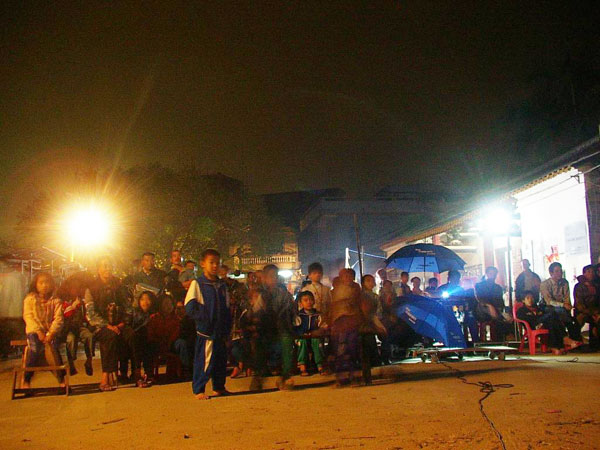 放映于我而言是第一次,我一边虚心地听从万叔和沛哥的指导,一边忙碌地作着放映前的准备工作,很快就完全掌握了放映工作的流程。我强烈地感到当地群众对我们相当欢迎,因为我们一到放映现场,马上就吸引了村民的注意,不少村民帮助我们找电源、挂银幕,有的则好奇地问我们今晚放什么电影,有的马上回家把凳子搬了出来霸“头位”。晚上8点,电影准时开始放映,当晚放映的是战争片《太行山上》。在电影正式开始之前,我们先播放了知识性的交通安全宣传片,以提高村民们的交通安全知识和意识。电影开始之后,所有人都聚精会神地观看,每到高潮处,都引来观众的阵阵惊叹。电影完场后,我们快速地把放映工具收拾好搬上面包车,工作井井有条。晚上10点半,我们回到休息地点,结束了第一天的放映工作。