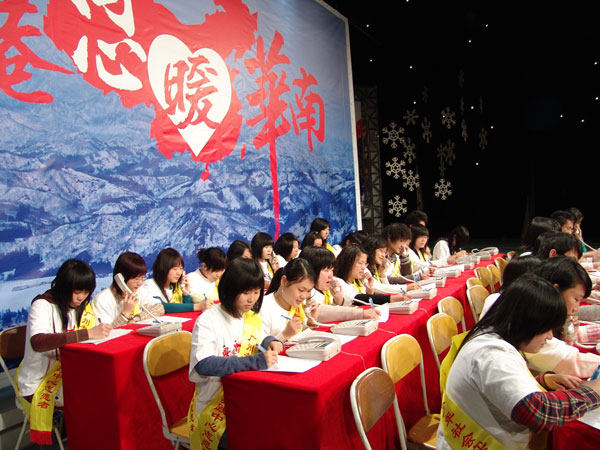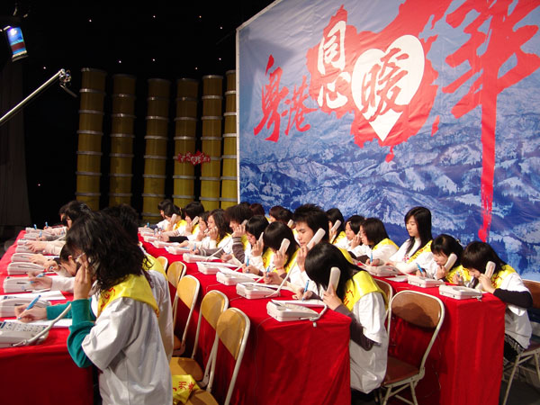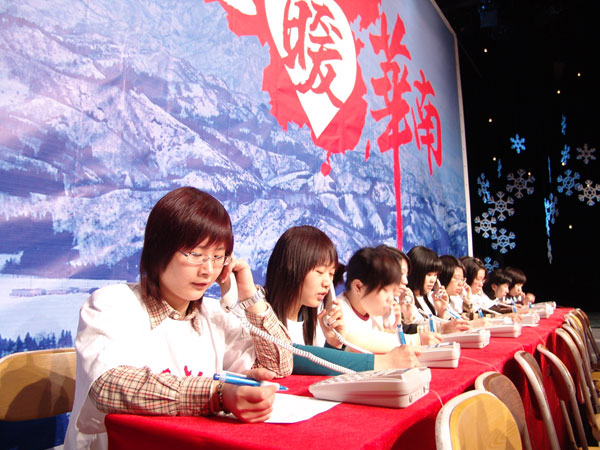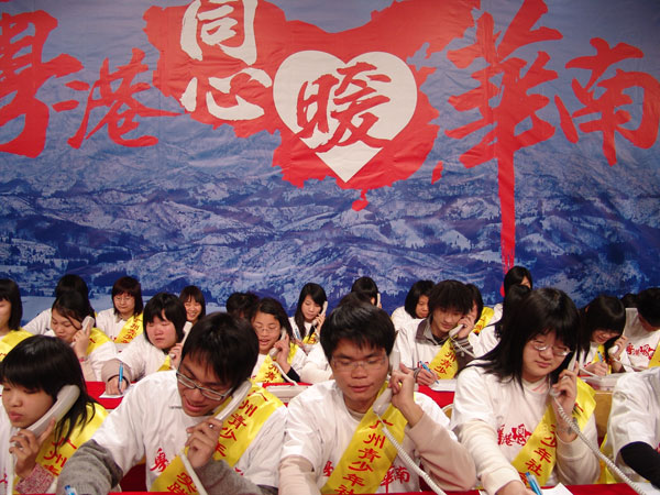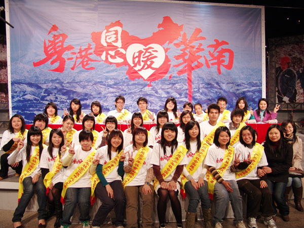 为了让华南地区受冰雪灾害影响的人民早日重建家园,尽早恢复正常的生产生活,2月20日,广东电视台和香港亚洲电视台联合举办了“粤港同心暖华南”大型赈灾晚会。应广东电视台的邀请,青宫青少年社会实践指导中心协助招募并组织了200多名志愿者参与本次节目的捐赠热线接听和现场录制工作,为救灾做力所能及的工作。
