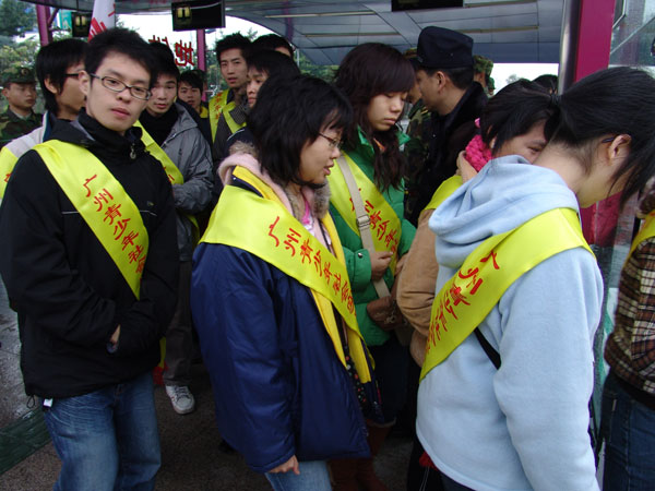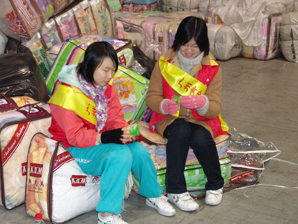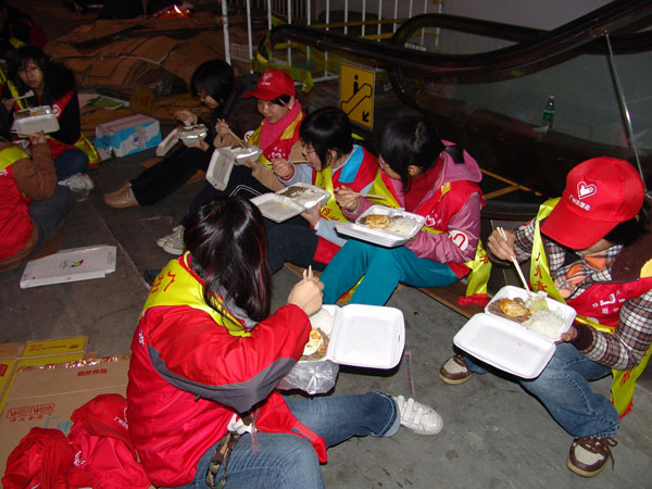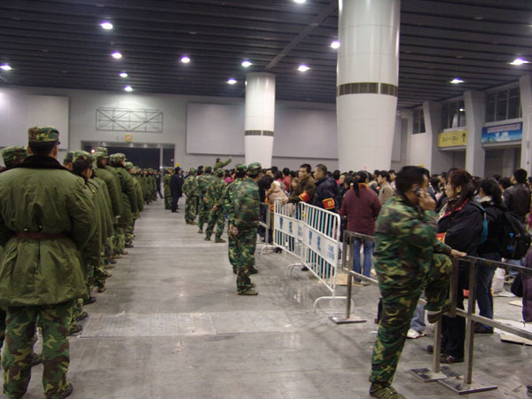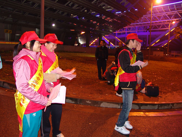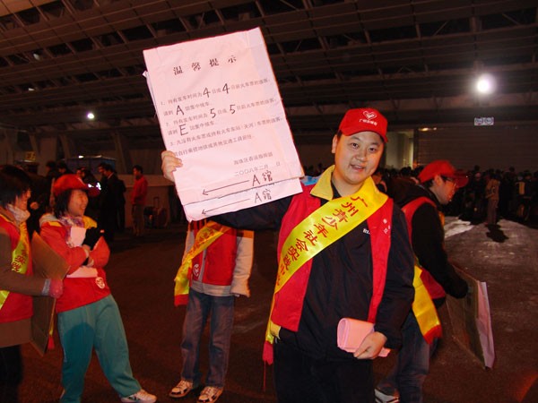 夜色渐深,风大了,雨点也密了,但志愿者仍然坚守在自己的岗位上,耐心而热情地向行色匆匆的旅客们解释、劝说,越来越多的乘客配合我们的工作,进入展馆等候乘车。时间一点点过去,这时对讲机传来通知:“大家注意,A馆的乘客已满,从现在开始,所有的旅客往B馆疏散,请场馆外的男生到A馆帮助旅客搬运行李!”大家又忙碌起来……