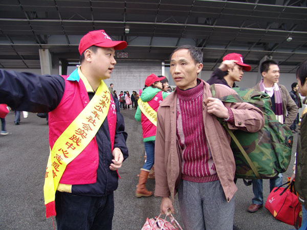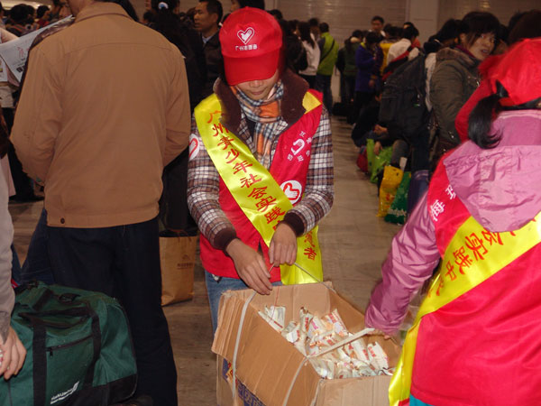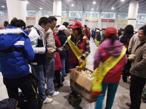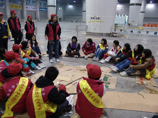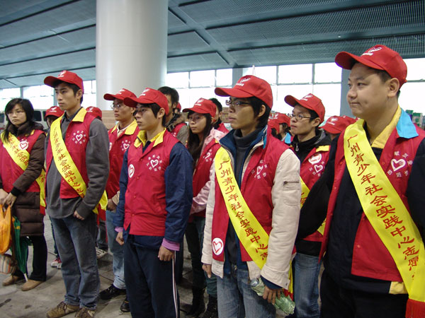 从1月3日开始,广州告别了昙花一现的冬日暖阳,又下起了淅淅沥沥的小雨。许多滞留广州火车站的外来务工者都希望能赶上年前最后一天的返乡列车,令火车站及火车站周边地区的客运压力骤然增加。青宫青少年社会实践指导中心在接到团市委要求增援的通知后,在3个小时内紧急召集27名志愿者奔赴琶洲国际会展中心,对该处的滞留乘客进行物资派发和疏导解释工作。