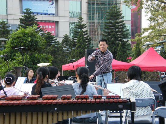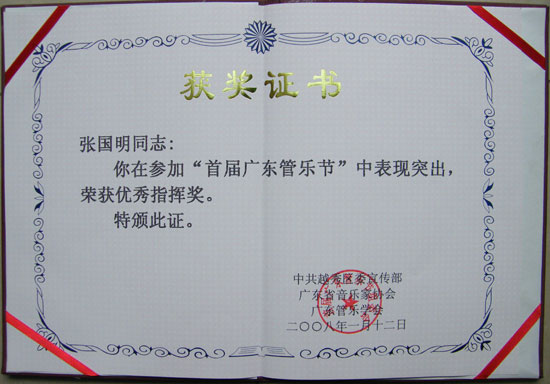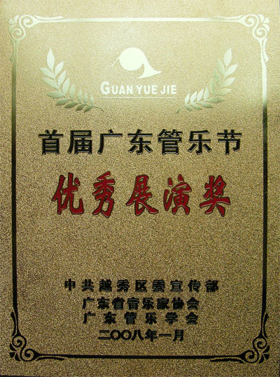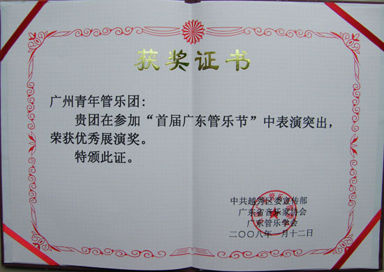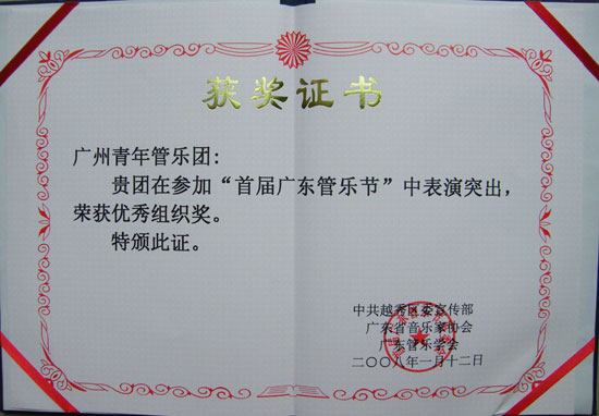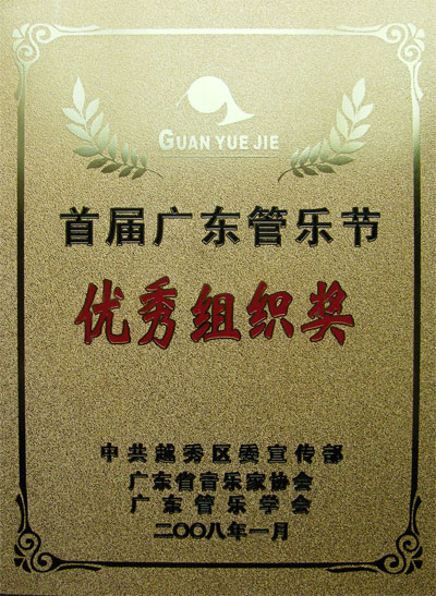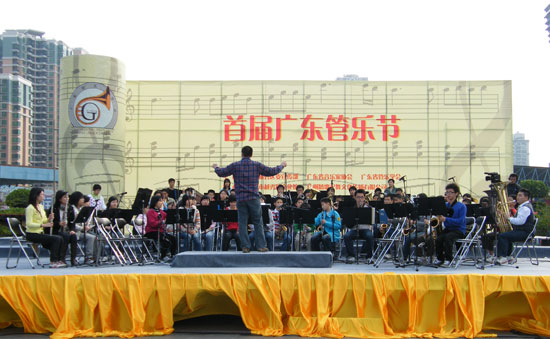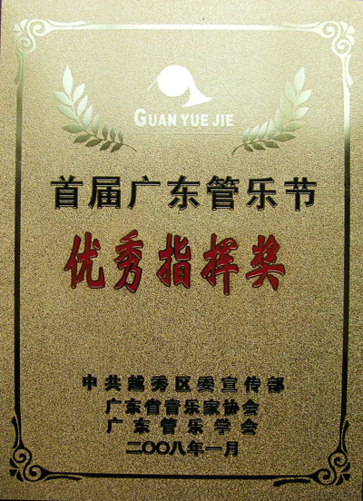 1月13 日下午,青宫的青年管乐团参加了广东省首届管乐艺术节广东省优秀管乐团队的展演活动。此次演出在英雄广场举行,青年管乐团的演出不仅受到群众的欢迎,而且得到了同行、专家的肯定。省管乐协会会长席伟泷向青年管乐团颁发了“优秀展演奖”和“优秀组织奖”,乐团指挥张国明先生获得“优秀指挥奖”。