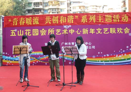 2008年元旦当天,天河区五山花园的会所非常热闹,这里正举行“青春暖流 共创和谐”系列活动的前奏——五山会所艺术中心新年文艺联欢会。