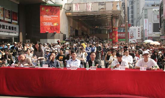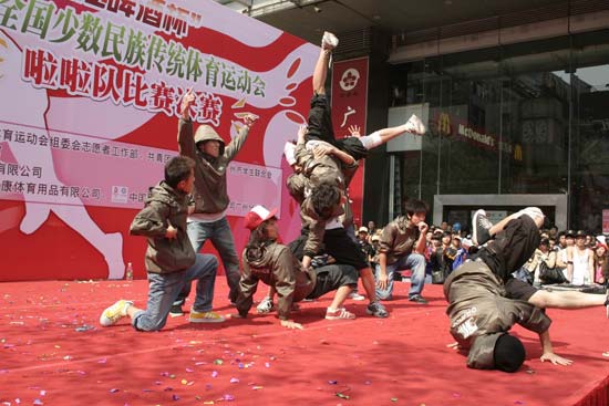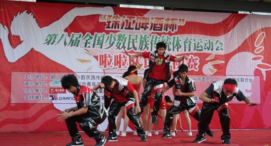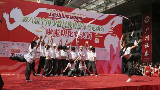 今时今日的啦啦队,已经不是仅仅叫“×××,加油!”的口号而已,他们的助威形式增添了许多可观性极强的表演元素,成为现代竞技场上一道不可或缺的风景线。世事无绝对,啦啦队也有成为主角的时候,由第八届全国少数民族传统体育运动会组委会志愿者工作部、共青团广州市委员会、广州市学生联合会主办,广州市青年文化宫承办的“第八届全国少数民族传统体育运动会啦啦队比赛”于11月4日在北京路步行区的西湖路段举行,在3日的初赛中脱颖而出的17支大中学校组成的啦啦队参加了比赛,市学联秘书长黄志勇、市青宫副主任李约坚等领导在现场观看了比赛,并担任比赛的评委。