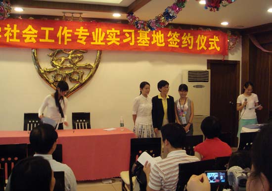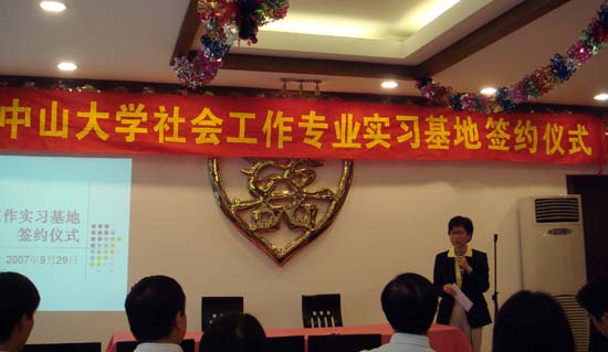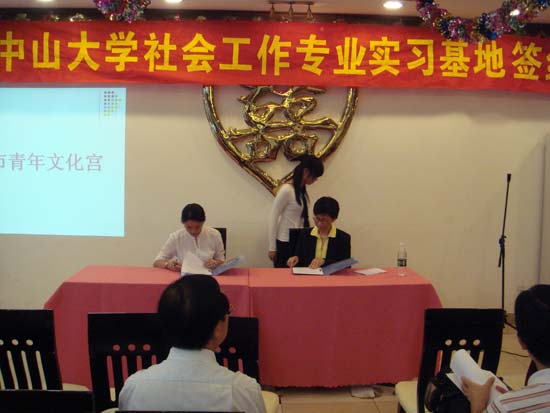 为推动青少年社会事务工作的不断发展,用更专业的理论、方式和人才促进青宫发挥青少年校外素质教育阵地的作用,9月29日,青宫与中山大学社工系在中大紫荆园举行2007社工系实习基地签约仪式。青宫主任助理、青年中心主任翟芸稚代表青宫与中山大学社会工作系罗观翠主任签约,成为该系第三批社会工作实习基地。在签约仪式上,罗观翠主任从一位香港资深社工的切身体会讲述了从事社工工作的意义,在感谢各合作机构大力支持的同时,希望广大社工学子能够充分运用所学,为实习机构做好社会服务工作。