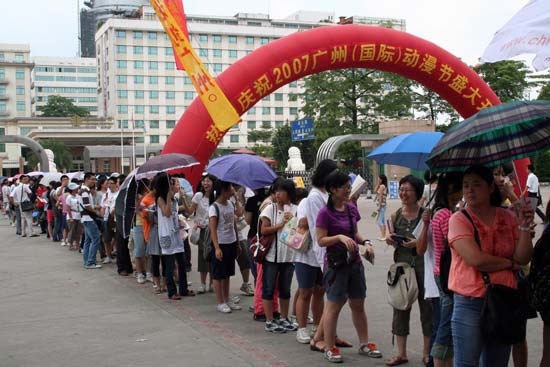昨日,2007广州(国际)动漫节在中国进出口商品交易会流花展馆盛大开幕。据悉,本次动漫节为期4天,共有300多个社团展出。昨天上午,喜欢动漫的广州青少年早早就在展馆外排队等候进场,场面十分火爆,甚至有“漫友”为求一签名不惜提前两小时入场等候。