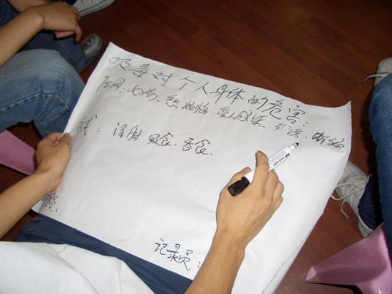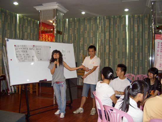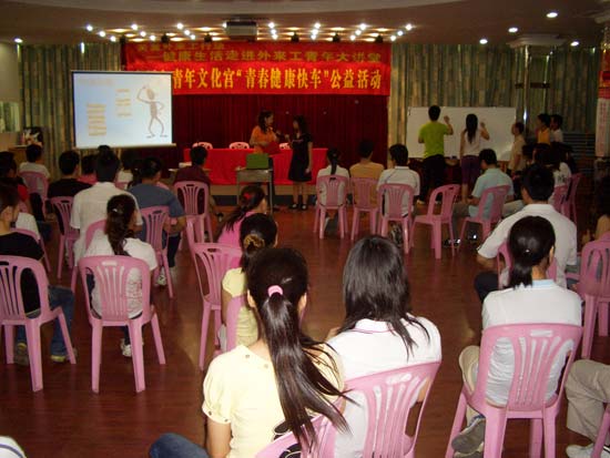 据调查,目前青年外来工对待婚前性行为相当开放,为此团校联合青宫举办了以“珍惜生命,健康生活”及“阳光心态,和谐生活”两大主题的教育培训讲座。首个讲座是由青宫张恽老师主讲的“珍惜生命,远离毒品”。游戏、快速联想、小组讨论、即兴表演……活泼的形式,融洽的氛围令参加者放下包袱,消除隔膜,全身心地投入到了学习、体验、享受和深深的思考中。