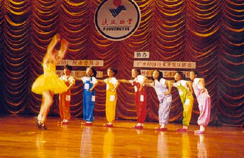 七月三日上午,平日并不平寂的广州经济技术开发区文体中心更显热闹。经过装点布置的礼堂聚集着近千名来自开发区第一小学的学生及各界嘉宾。在这里举行一个以“扶孤助学,奉献爱心”为主题的活动。这是共青团广州市委、广州青年文化宫联合举办“广州——三坪‘两思行’系列活动”的第一项活动。