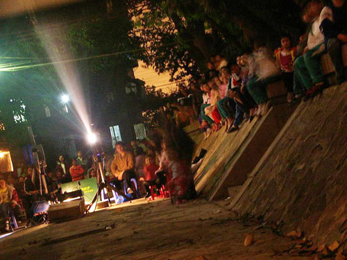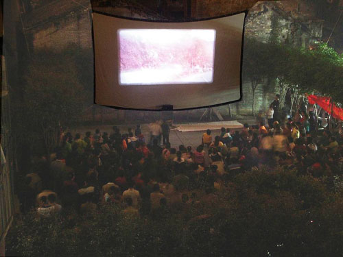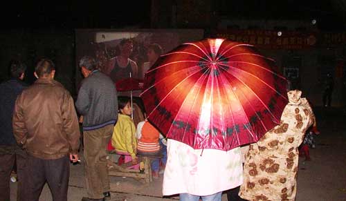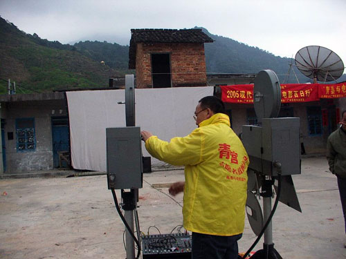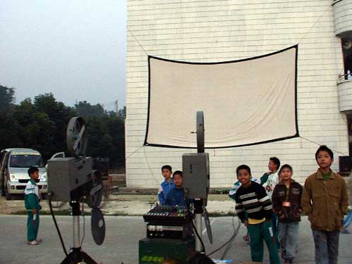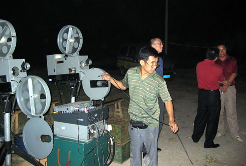 “《外来媳妇本地郎》”,小黄和小李异口同声地说。他们是某新闻出版学院的大一学生,也是今晚的放映员。小黄是“老手”了,前后放过了20多次,已经可以熟练地操作放映电影的每个环节。同学小李也是被他“吸引”过来当志愿者的。小黄说:“参加放映队除了可以学点技术以外,还能见识到每个地方不同的人文、历史、环境等等,这是在学校里无法学到的。而且放的是以教育片为主,对落后的地方是一种教育,对我们也是有着警醒的作用。”“虽然有时候会很累,但从没想过要放弃。”
