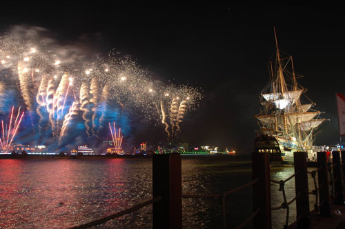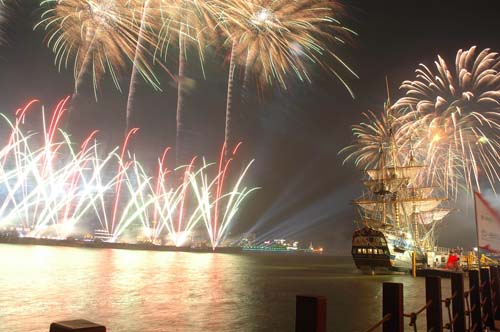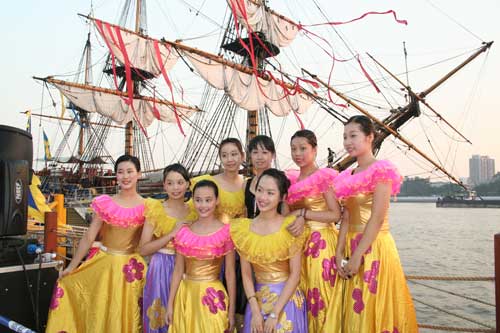 一个两个半世纪的梦成真了!7月21日傍晚,歌德堡号静静停泊在广州洲头咀码头,在落日余辉中披上了一层金色华彩的它,显得格外伟岸。当晚,在以它为背景的立体舞台上,广州市政府举办的名为“百年情缘聚珠江──欢迎歌德堡号访问广州大型焰火文艺晚会”,在热烈、祥和的气氛中举行。