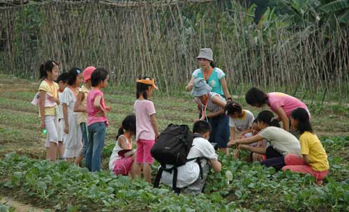 第二天,我们在当地孩子的带领下穿过一大片田野和汩汩而流的小溪,土地与溪水共同组成了一幅秀丽的田园风景画。就在这个空气清新、带着浓郁乡土风情的地方,我们进行了“DIY”厨艺大比拼。“比赛要求以小组为单位进行,组员必须分工合作,互相协调,注意用火安全和环境卫生……”没等老师说完注意事项,“我摘蔬菜!”“我切菜!”“我炒菜!”“我生火!”同学们已经唧唧喳喳地抢着干起来了。