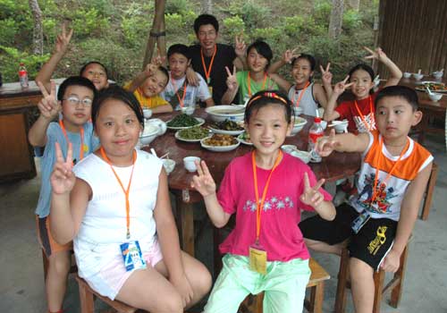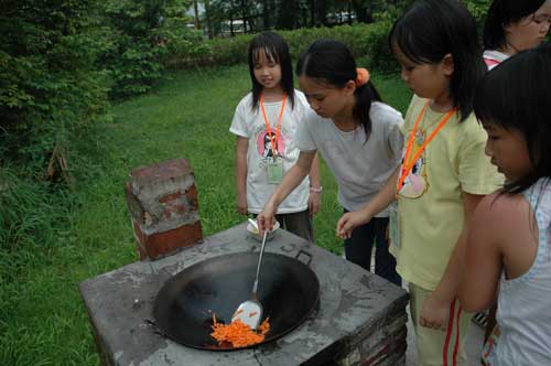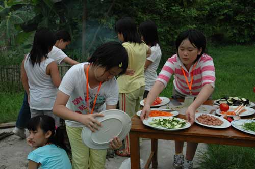 不一会儿,负责摘蔬菜的同学提着篮子从田里回来了,他们也顾不得满手满脚都是泥巴,又干起来了,有的洗菜,有的生火,有的准备调料,大一点的同学负责设计菜式,务求在搭配上打动评委的心。“你们俩过来这边帮忙!”小组长们在调配人员,大家都忙成一团,更顾不上额头的汗水、脸上的灰。不一会儿,锅红了,油热了,下菜了,烟呛得同学们流鼻涕掉眼泪了,之后一个接一个菜都做好了。“虽然卖相不怎么样,但味道很好!”评委老师一致认可了!“Yeah!”同学们已经迫不及待地品尝起自己的作品了……看着他们,真不相信他们是平时过惯了优越生活的孩子。