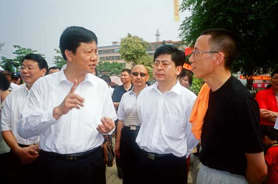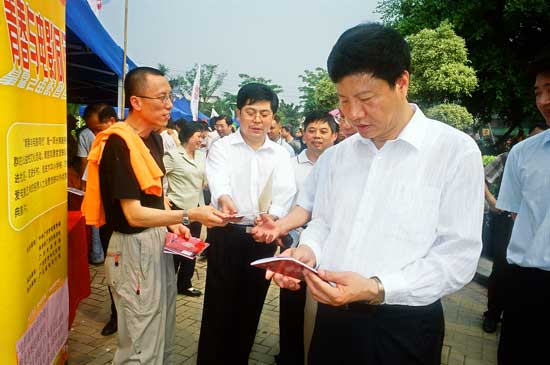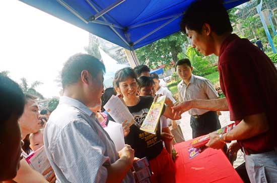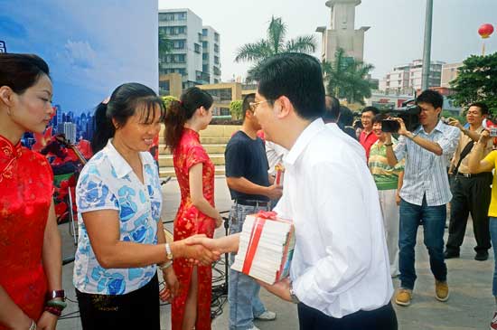 在“三下乡”启动日的服务现场,居民们为了领取一本《长征传奇》在我宫的摊位前排起了长长的“人龙”,面对居民们如骄阳般火热的热情,队员们发书发到手软,二明哥更是连“擦汗”的时间都没有。熙攘的人群中有的是小孩子自己来排队,有的是年轻一代的动漫迷,也有的是年轻的父母想借此书来教育孩子,更有一些鬓白如银的老者要为自己的孙子、孙女带回有趣的读物……一位年轻的妈妈,背着孩子、顶着烈日耐心地排队半小时,领到书后又立即与儿子一起在树荫下兴致勃勃地看起来。问她为什么这么热切地想领到一本《长征传奇》,她憨厚地笑道,“很有趣,应该也很有意义,我想小孩子看正好……”是啊,村民们的愿望其实很纯朴,只要我们心贴心地为他们设想,就能为他们送去新的阅读资讯与方式,送去他们能接受且乐意接受的先进文化。市委常委陈建华在团市委折志凌副书记的陪同下参观了我宫放映队的摊位,他拿着《长征传奇》欣喜地连说“这个好,这个好……”,领导的肯定与重视大大鼓舞了我们现场的工作人员。