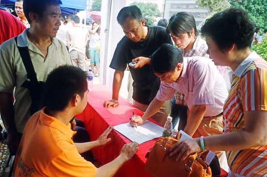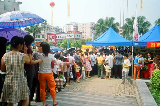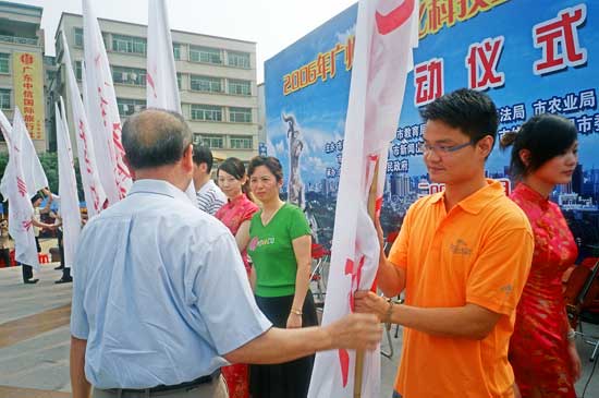 5月11日上午,骄阳似火,“青宫大学生志愿放映队”代表团市委参加了由市委宣传部、市文明办、市教育局、市科技局、市文化局、市卫生局等14部委联合举办的2006年广州市文化科技卫生“三下乡”活动启动仪式。放映队的志愿者代表从市人大副主任陈传誉手中接过了“大学生志愿放映队”的旗帜,并承诺以爱与关怀成就青春的闪光。在仪式过后的现场活动中,志愿者们带着知识、带着设备、带着技术、带着感情下乡,以自己的行动换取了群众的喜悦与信任,进一步密切了共青团、青年宫与人民群众的血肉联系。
