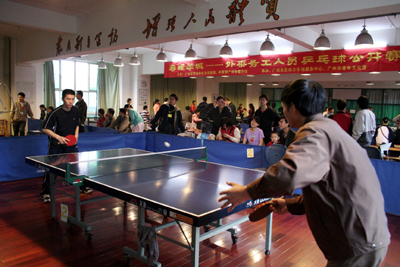 1月15—16日,清风扬起激情与关爱,我宫乒乓球俱乐部内“硝烟”四起却温情洋溢,由广州市春运办、市劳动保障局、共青团广州市委员会、市劳动力市场服务中心和我宫联合举办的“春暖羊城——外来务工人员乒乓球赛”在外来务工人员的期盼中,在主办机构的真挚关爱中拉开了帷幕。市劳动保障局巡视员刑诒波、副局长吴晖,市劳动力市场服务中心主任张宝颖,我宫领导出席了开幕式,刑诒波与越秀区的运动员代表以简短、有趣的较量主持了大赛的开球仪式。