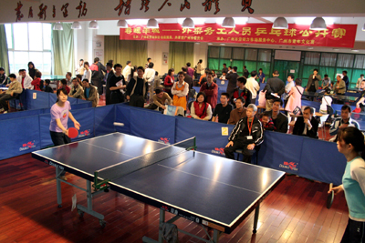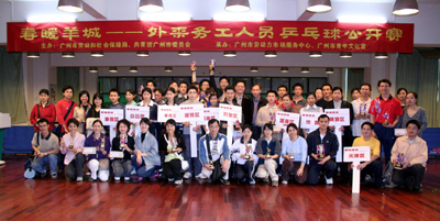 “春暖羊城——外来务工人员乒乓球赛”是今年广州春运工作开始的首项活动,也是春运“温馨服务”的系列活动之一,期望能通过乒乓球赛这种健康的竞技方式,为春节期间仍坚守岗位上外来务工人员送去温暖与祝福。球赛分男女混合团体赛、男子单打和女子单打三项进行,按国际惯例实行11分制和三局两胜制。经过初赛选拔后,各单位的精英好手组成了12支代表队,共68名运动员参加此次公开赛。