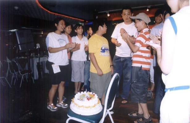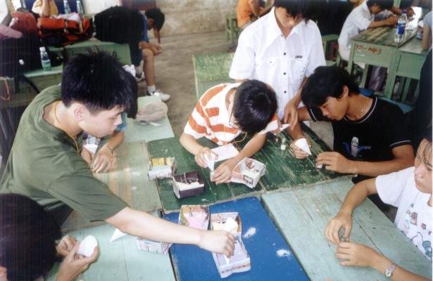 如果说穗港学生可以一拍即合的话,那么,穗港学生与清远的学生的友谊就显得“慢热”了。7月24日,穗港学生来到清远市清新县第三中学,与这里的学生玩游戏、开篝火晚会。开始时,清新县的学生很腼腆,尽管香港学生带来的游戏很新鲜、很有趣,而且在香港学生煸情的鼓动下也极想玩那些游戏,但他们仍止步不前,最后是香港学生花九牛二虎之力才游说成功,使清新县学生抛开羞怯,一起玩装彩砂、解手结、魔术画、传声筒、拯救地球等游戏。一个正在专心地往一个小瓶子里一层一层地装不同颜色的彩砂的清新县学生兴奋地对笔者说:“这个游戏真好玩。我曾在广州亲戚家见过这种彩砂瓶子,当时很喜欢,想不到今天我可以自己亲手做一个给自己。”
