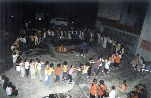 晚上的篝火晚会,三地学生围着热烈的篝火而坐,他们表演了自己的拿手节目。Para para舞、搞笑的小品、强劲的鼓乐、动听的独唱……精彩节目一个接一个,掌声、笑声不断,浓情似火,高潮迭起。当《壮志骄阳》的歌声响起,穗港学生玩起“走人龙”时,正襟危坐的清新县学生已经按捺不住了,加入了 “人龙”,这时已经无法分出他们各自来自何地,大家已融为一体……