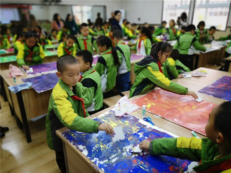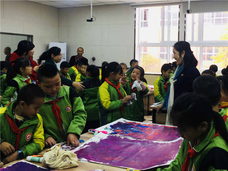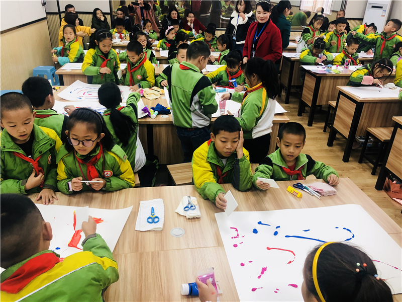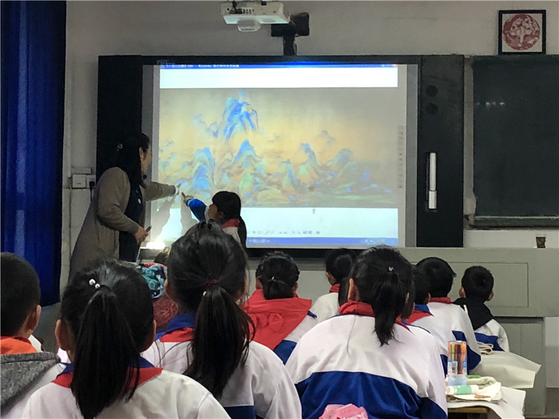 导师分别从《富春山居图》和“一片银杏叶”讲起,用造型、色彩、材质、肌理等美术语言传授关于中国画以及儿童画创作的美术知识,其中毕节市第二实验学校的一名女同学指着《千里江山图》的图画说:“我家的山也长成这个样子,远远看去呈椭圆弧形,有高也有矮,也有尖一些和高一些的山。山上的土有红色、棕色、黄色、土黄色和黑色,也一样的美丽。”而黔南州第三小学的同学们,因基本上没接触过颜料画,当他们像挤牙膏一样挤出绚丽的颜料时,眼里充满了好奇和兴奋,以至于颜料弄得满手、满身甚至脸上都是,仍然乐此不疲……