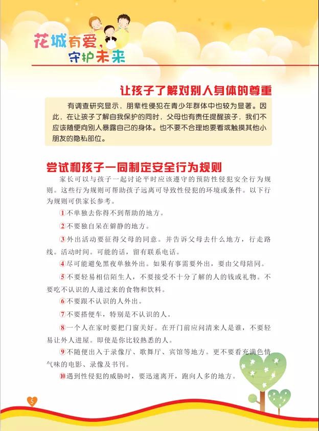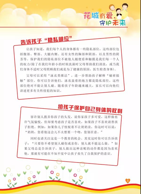 教孩子认识隐私部位,学会分辨好的接触、坏的接触,识别性侵害的信号,拒绝坏人的诱导和洗脑。