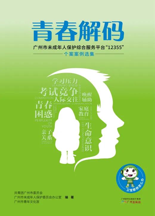 2020年,广州团市委、市未保办、广州市青年文化宫从12355广州青少年服务台过去积累的服务个案中选取了具有典型性的个案故事,编写出版了《青春解码——广州市未成年人保护综合服务平台“12355”个案案例选集》,选集分别从学习压力、青春期困惑、家庭教育、心理疾病干预四个方面呈现成长路上的荆棘困惑、家庭教育中的难点与痛点,还原个案情景,分享服务台处理方法,并给出具体建议。