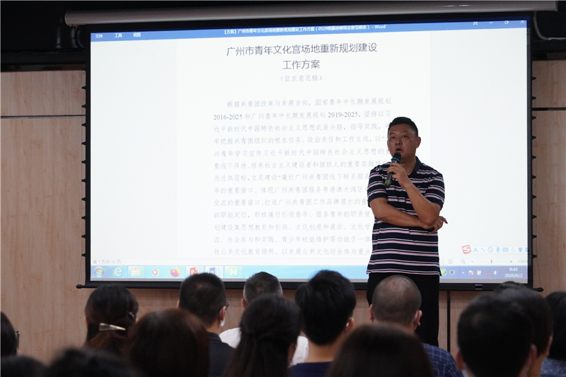 青宫党总支部书记杨俊东深入介绍《广州市青年文化宫场地重新规划建设工作方案(征求意见稿)》,方案以习近平新时代中国特色社会主义思想为指导,根据共青团改革与发展方向,国家青年中长期发展规划2016-2025和广州青年中长期发展规划2019-2025,结合北京路步行街改造提升试点工作要求,对青宫进行重新定位,并对现有的架构和项目做了梳理和调整,为广州青宫绘制了全新的发展蓝图,力争在五年内将广州青宫建设成为一个集思想教育和引领、文化创意和展示、文化学习和交流、社会参与和实践、青少年权益维护等功能于一体的综合性公共文化教育场所,致力于将青宫规划成“一个中心,两个关键词,三个场馆,五大工作体系”的服务功能区。