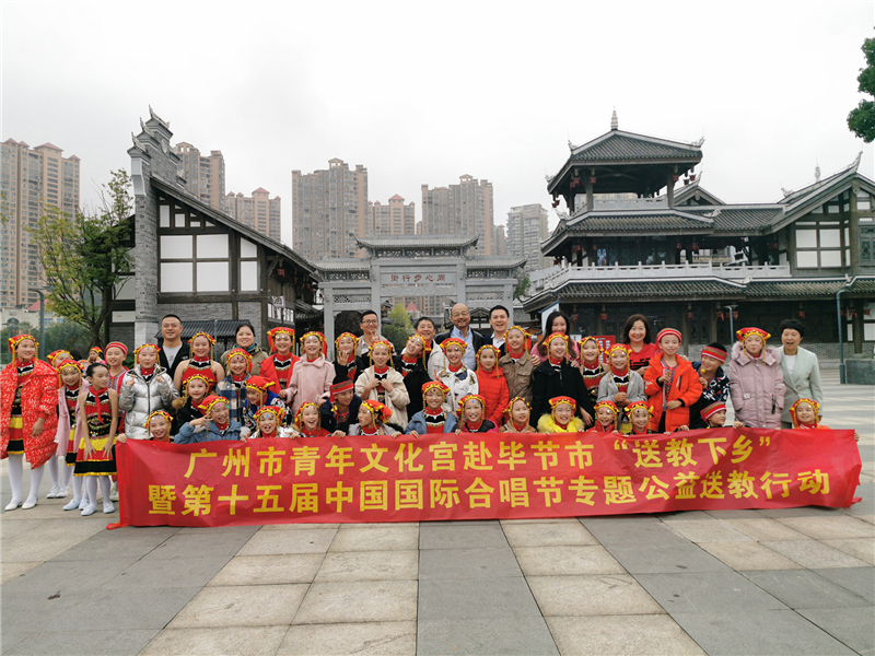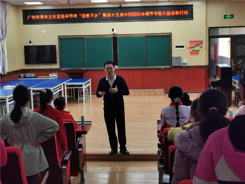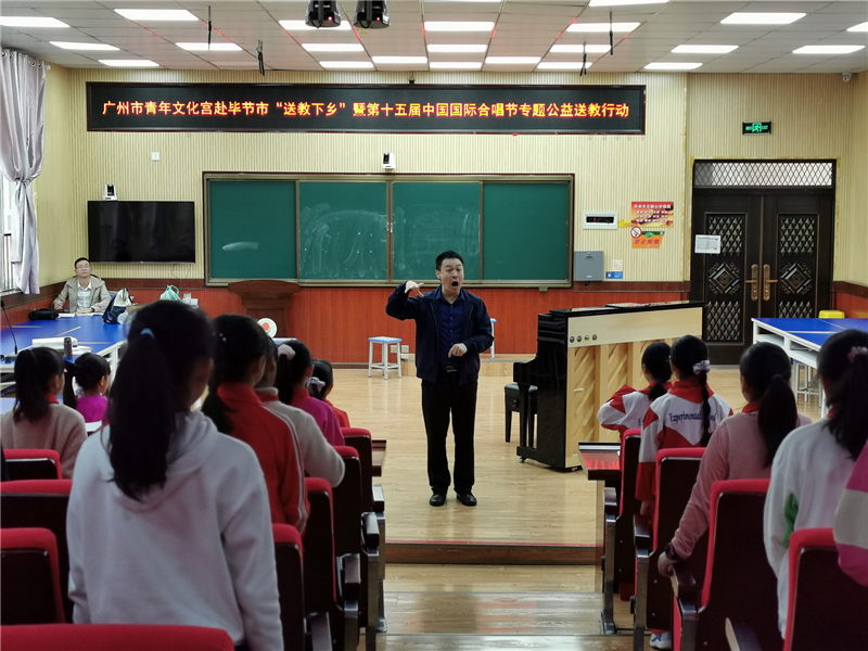 2020年9月26日-30日,广州市青年文化宫组织来自北京、广州的优秀合唱专家、教师赴广州市对口扶贫地区毕节市开展“送教下乡志愿行”公益行动,联手一线合唱教育名师实现名家师资“落地”教学,把创新有效、可复制的教学方法与经验带到贫困地区合唱团里去。