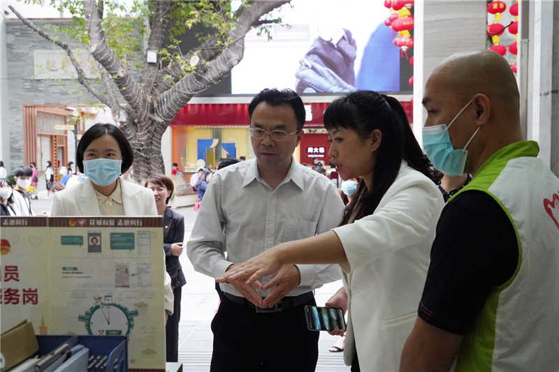 10月22日下午,团中央青年志愿者行动指导中心党委书记、中国青年志愿者协会副会长兼秘书长张朝晖、团中央青年志愿者行动指导中心组织培训处副处长王晓茜到市青年宫调研粤港澳大湾区青年家园。在团市委书记徐柳、市青年宫党总支书记杨俊东、主任唐勇、五级职员吴启光、副主任槐涛的陪同下,依次参观了青宫蝶变、青年公益直播间、城市导览、粤菜文化印象馆、城市记忆长廊、粤港澳大湾区青年文创集市、粤港澳大湾区青年家园、志愿驿站等版块,重点对志愿驿站室内“旗舰店”的建设运营提出指导意见,并参加了团省委在市青年宫举行的县级青年志愿者协会建设座谈会。