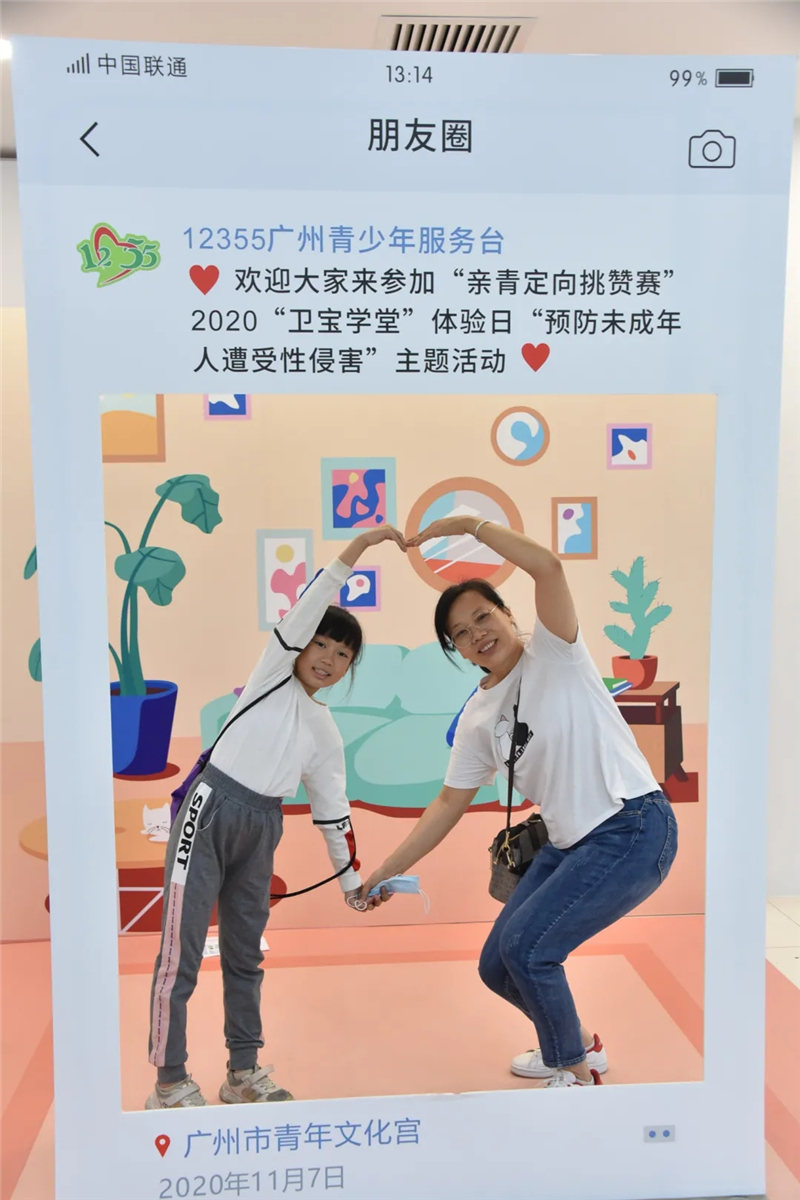 活动中,“认识隐私部位摊位”、“认识好、坏接触摊位”、“安全自护情景判断摊位”等任务摊位均需要亲子共同参与,孩子与家长合作通关,收获欢乐与自护知识。“我最喜欢认识好坏接触摊位的游戏,以前对一些接触不知道怎样判断和应对,现在我知道了!”参赛选手黄同学与妈妈共同摆出了拥抱的姿势并在背景板前留影,“如果同学要和我拥抱,我觉得不舒服,是可以果断拒绝的!”