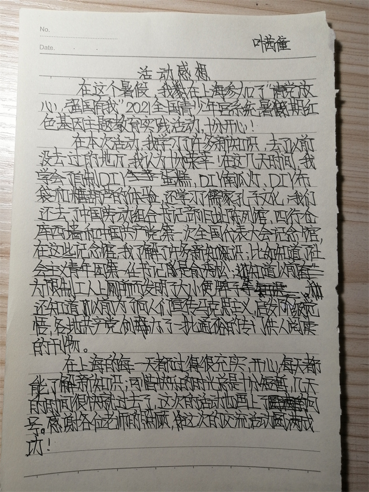 在本次活动里,我学习到了许多新的知识,去了以前没去过的地方,我学会了自制DIY蛋糕,手工南瓜灯、布袋和糖葫芦,即增强了我的动手能力也品尝到了自己劳动的成果, 我还学了儒家传统文化,了解了很多古代人的礼仪,我和同学、老师们一起参观了中共一大纪念馆,我十分荣幸能参加这次活动,以后一定要好好学习,希望下次还能参与这么有意义的活动。