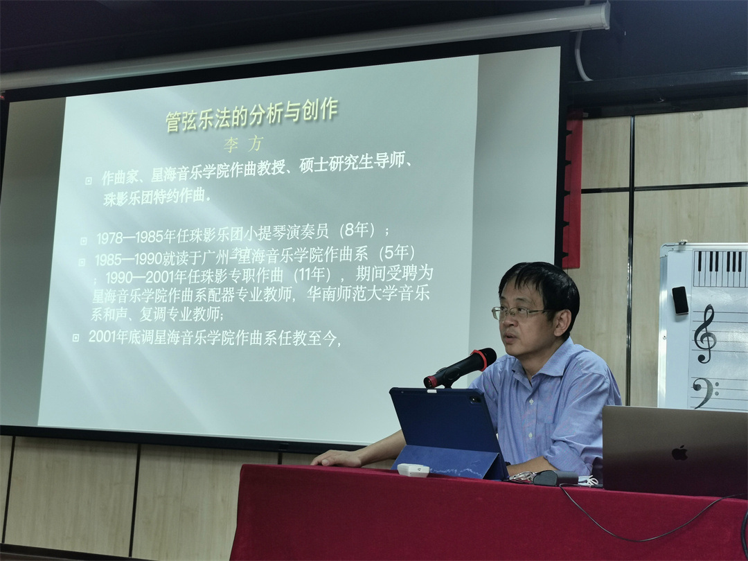 11月2日,星海音乐学院作曲教授、硕士研究生导师、珠影乐团特约作曲家李方老师为大家传授《管弦乐队编配的思维与技巧》,围绕如何为乐队编写管弦乐及演奏员如何认识声部在乐队中的作用等内容,讲述了管弦乐队编配的思维与技巧。同时强调管弦作品编配要符合大众需求,创编的源泉应来源于百姓生活,服务于百姓生活。李方教授的课堂既充满了技术含量又妙趣横生,他深入浅出的讲解和实效性谱例分析激发了场老师们的学习热情。