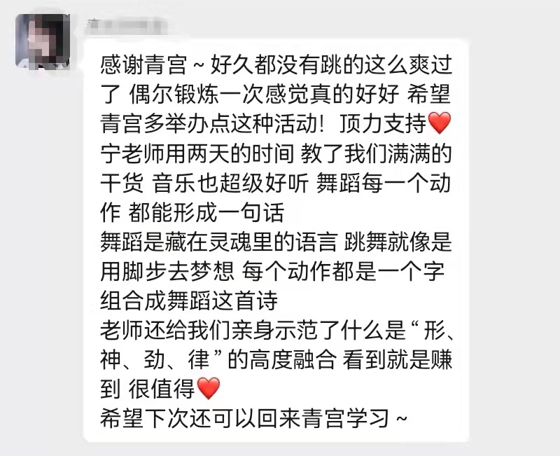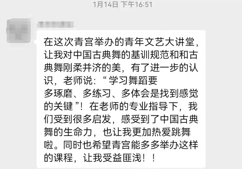 为搭建优质的学习交流的平台,服务广大青年文艺爱好者。2022年1月13-14日,广州市青年文化宫“青年文艺大讲堂”第二期如约开讲。本期邀请到广东舞蹈戏剧职业学院舞蹈系高级讲师宁丹为来自广州周边十多名舞蹈教育工作者及文艺青年进行为期两天的“沉浸式”小班教学。宁老师深入浅出的风格,让教师及青年在动作实践中更加深刻地了解舞蹈中“行、神、劲、律”教学的方法与规律,在一个个行云流水、灵动跳跃的组合中变得有依可循,有法可依。
