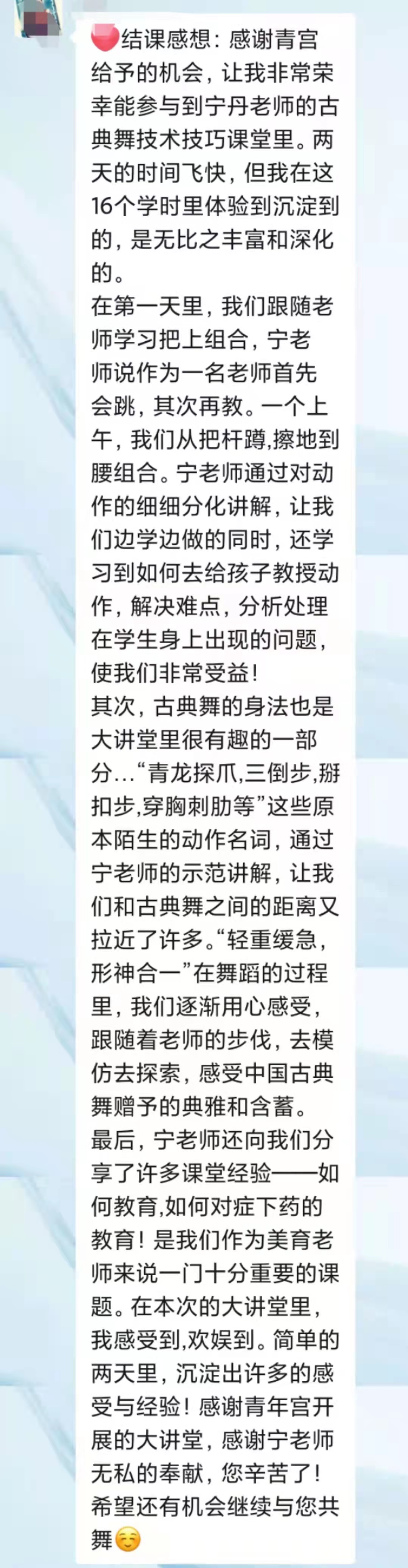 宁老师认为舞蹈教育工作者及文艺青年在舞蹈教学中要善于利用学生好奇心强,爱模仿的特质启发引导学生,通过语言生动、课程内容生动,激发孩子的兴趣和学习主动性。同时,宁老师与学员们共同解密了“青龙探爪”、“燕子穿林”、“穿凶刺肋”等动作的运动线路和原理,将晦涩的舞蹈语言生动地展示出来。